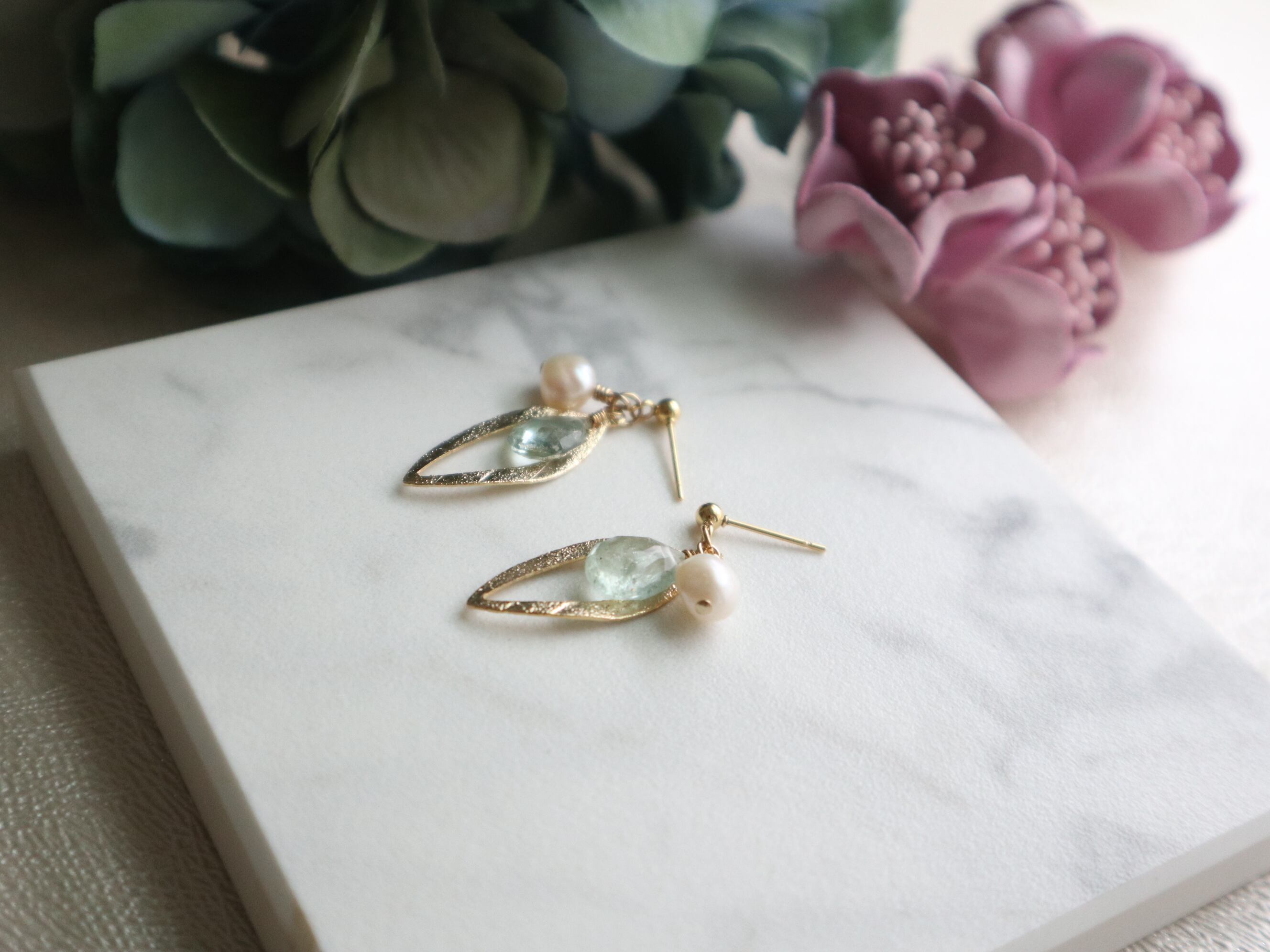 海のように澄んだブルーのアクアマリンと、柔らかに輝くパールを合わせたピアス。